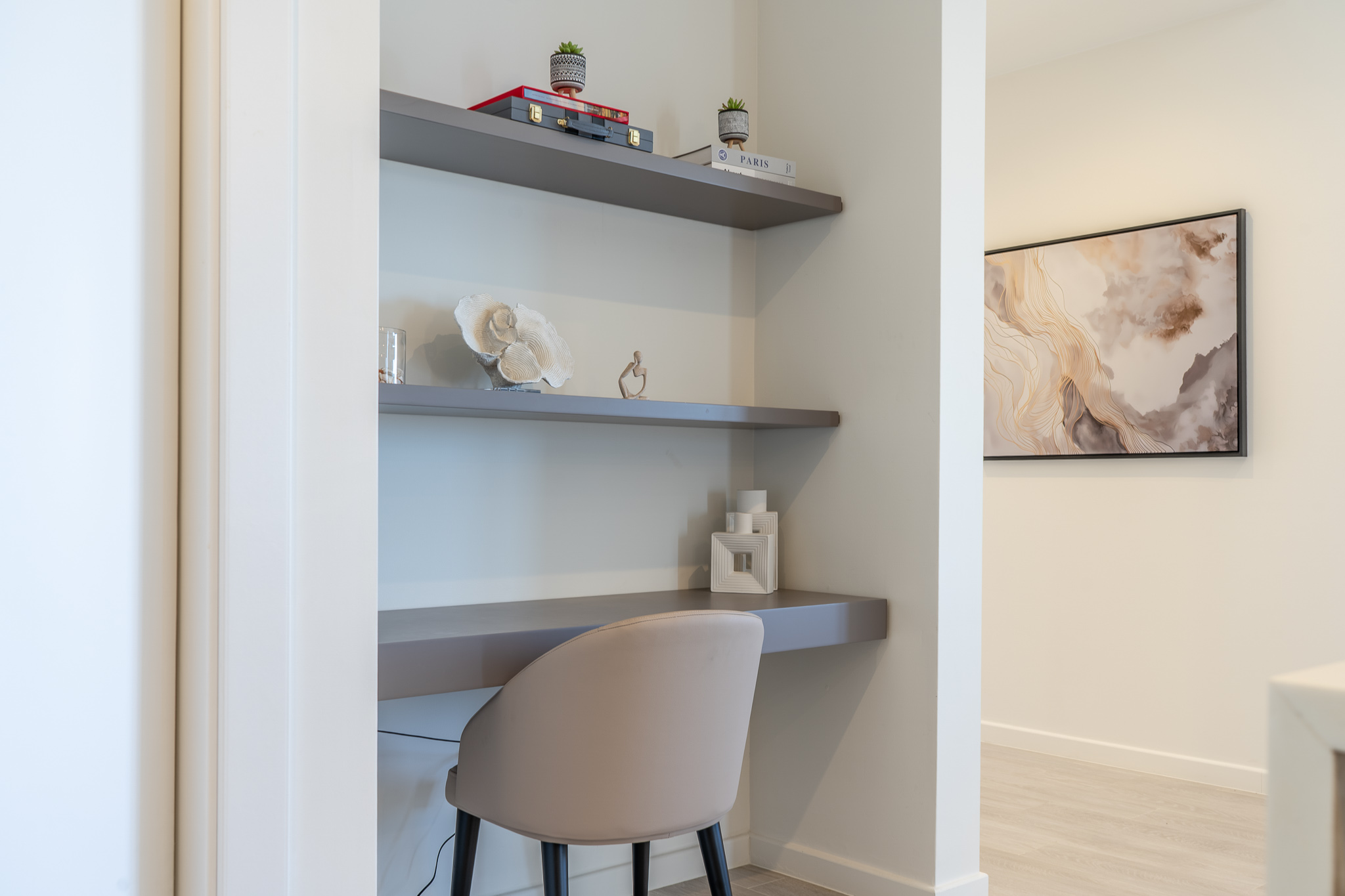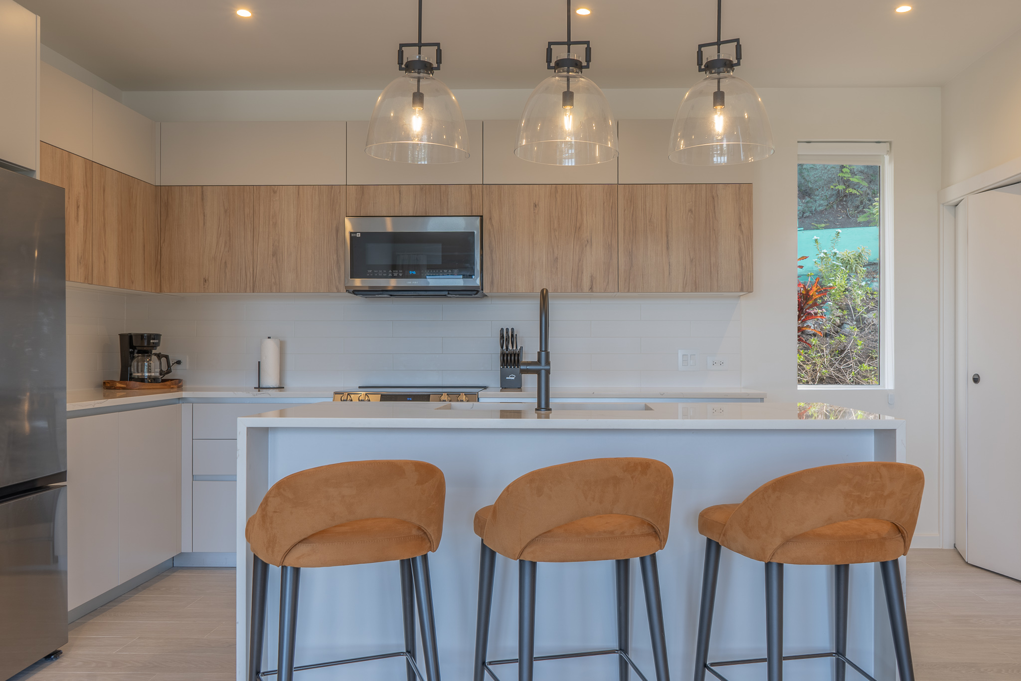 The living area is design as a bright, open space that connects seamlessly with the kitchen, creating a relaxed and functional setting during your stay. It includes a smart TV, air conditioning, a kitchen island for casual dining, and a dedicated work area.