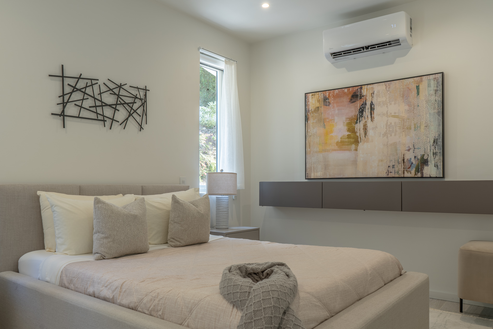 The primary bedroom features a king-size bed, en-suite, ample closet space, a smart TV, and tranquil hillside views. The second bedroom offers a queen-size bed, a smart TV, and easy access to a full bathroom.